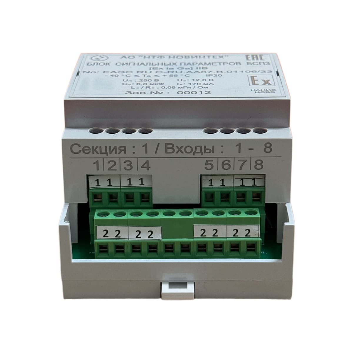 Разделение искроопасной и искробезопасной частей ЯСП обеспечивается оптронной развязкой. ЯСП подключается к шине CAN с помощью клемм “CL”,“CH”. Искробезопасные входы БСП вводятся на клеммы (“B1 1 2”,…, “B8 1 2”). Два контактаобслуживают один вход типа «сухой» контакт. Номер входа определяется расположениемконтактов на БСП и логическим адресом БСП (диапазон логических адресов БСП 0 –7), который заносится в него при изготовлении. После занесения логического адреса в БСП на негонаклеивается этикетка с надписью.